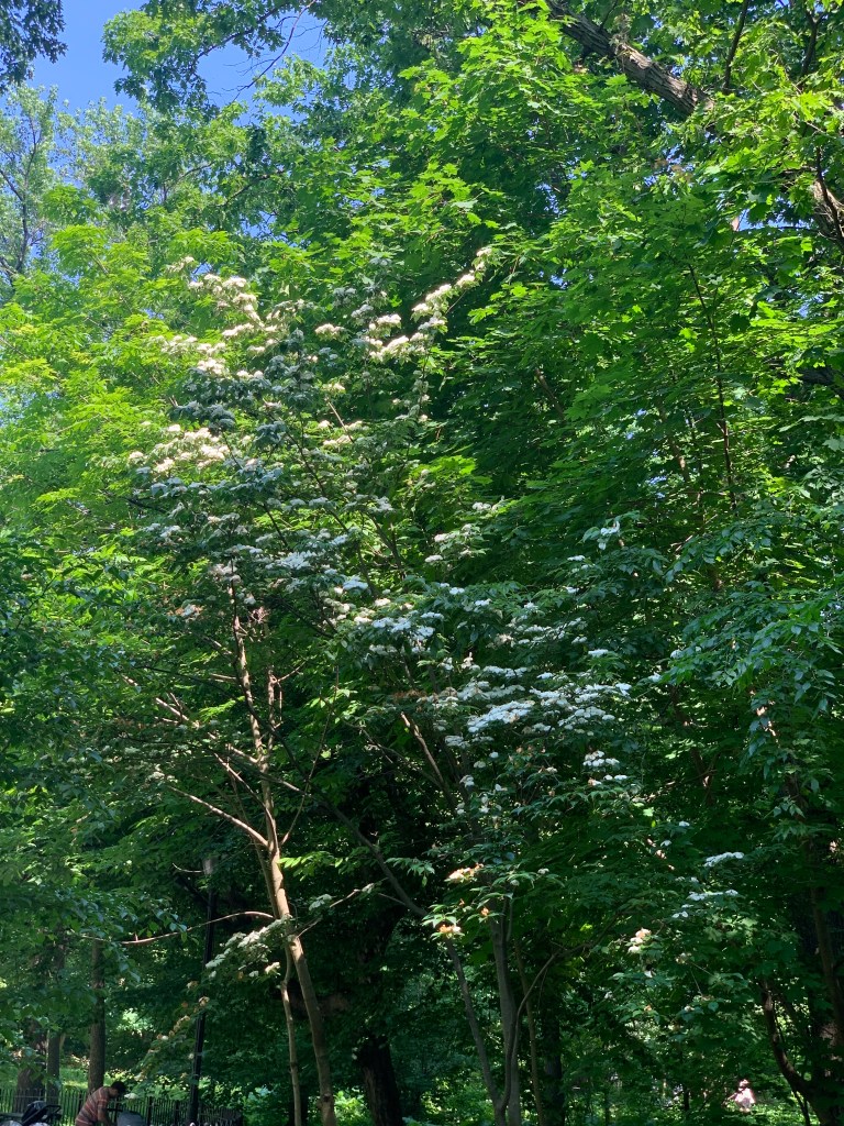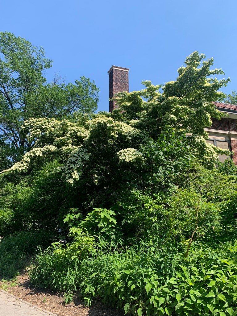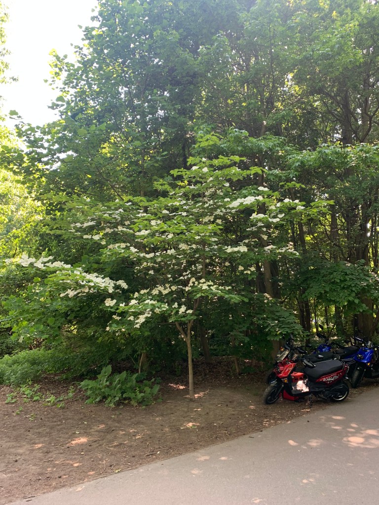 You may have noticed that these are not the same Dogwoods that bloomed in late April- to early May. The early bloomers bloom without leaves, and these bloom together with their green leaves.