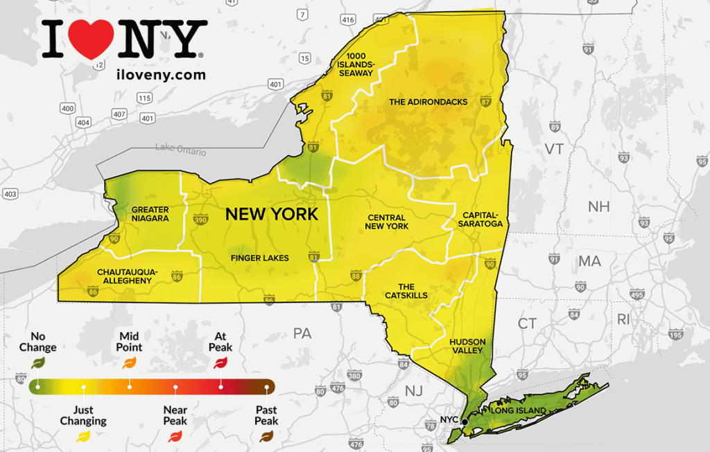 - NY – I love NY foliage report – This popular IG page with a website gives a weekly report on the foliage progression around NY state. Reports are obtained from volunteer field observers and reflect expected color conditions for the coming weekend. Reports are issued every Wednesday afternoon.