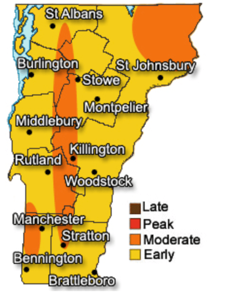 - Vermont – Vermont’s official website provides foliage reports based on the Vermont Department of Tourism and volunteer members of their “Leaf Squad” from around the state. Their foliage levels are simple and have only four stages.