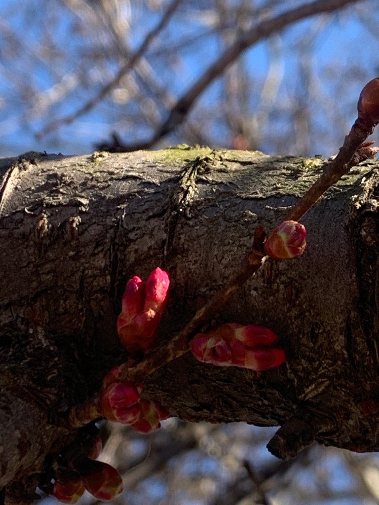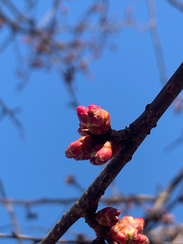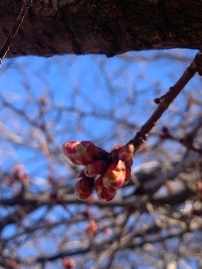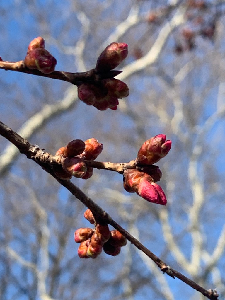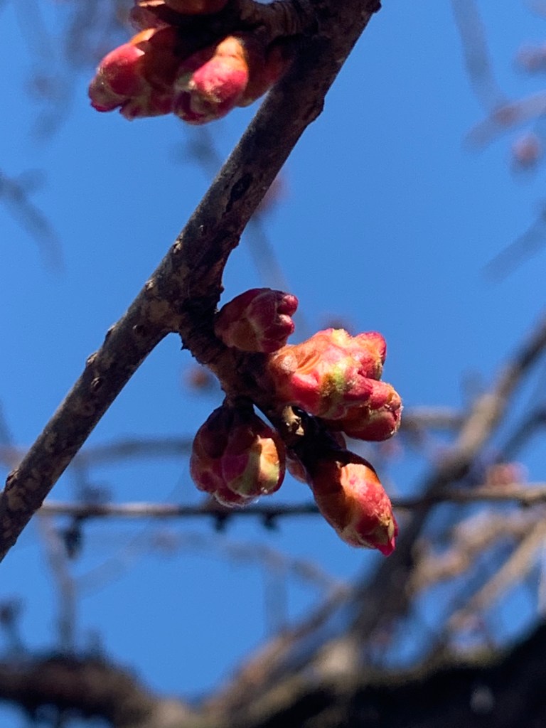 Okame Cherries, which last year bloomed in late February, are in progress stage, and some flowers are peeping out.