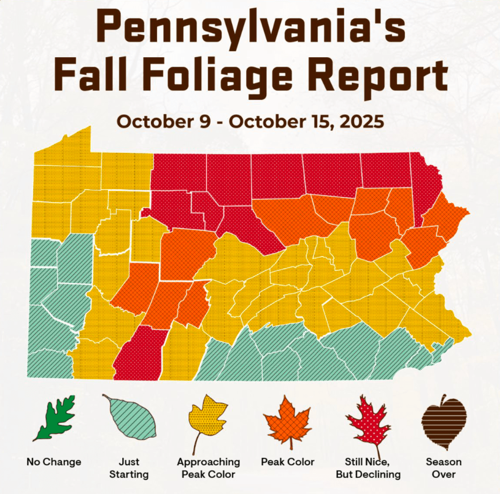 - Pennsylvania – PA DCNR follows the fall season with complete reports with all PA regions. Like Maine, they also set 6 different levels of foliage progression.