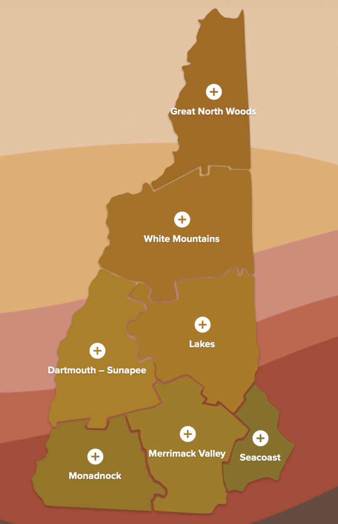 - New Hampshire – VisitNH website gives detailed foliage reports. While others use maps to visualize the foliage progression around the state, NH provides information about the seven zones.